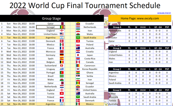 World Cup 2022 - ngày hội bóng đá lớn nhất hành tinh, đã bắt đầu khởi tranh. Bộ lịch thi đấu thông minh và tiện dụng dưới đây sẽ giúp bạn dễ dàng theo dõi và không bỏ lỡ trận đấu hấp dẫn nào cũng như xem bảng xếp hạng của các đội bóng trong cùng cùng một bảng.
