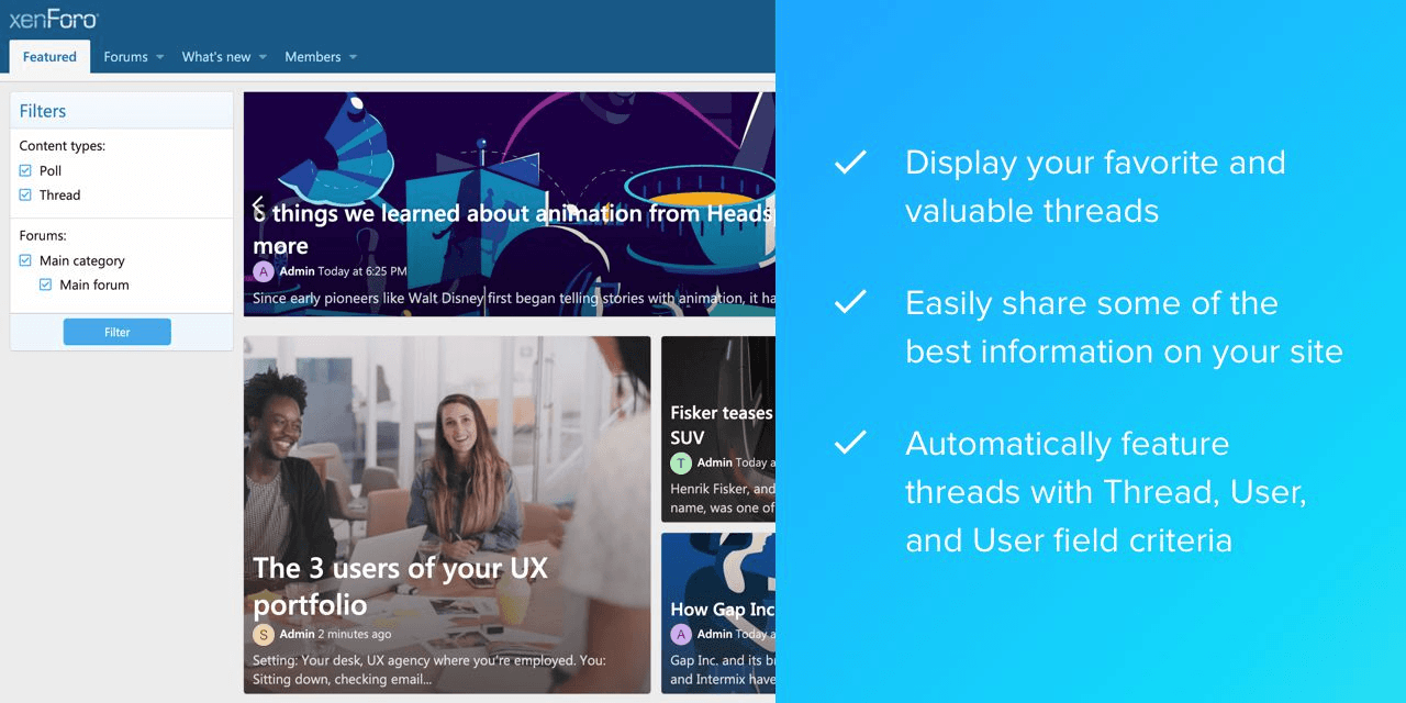 Thu hút sự chú ý và duy trì sự tham gia với các chủ đề đặc trưng. Làm nổi bật các chủ đề yêu thích và có giá trị, cung cấp cho cộng đồng của bạn một cách dễ dàng để xem một số thông tin tốt nhất trên trang web của bạn. Tạo một trang hiển thị các chủ đề nổi bật và có thể tạo widget!