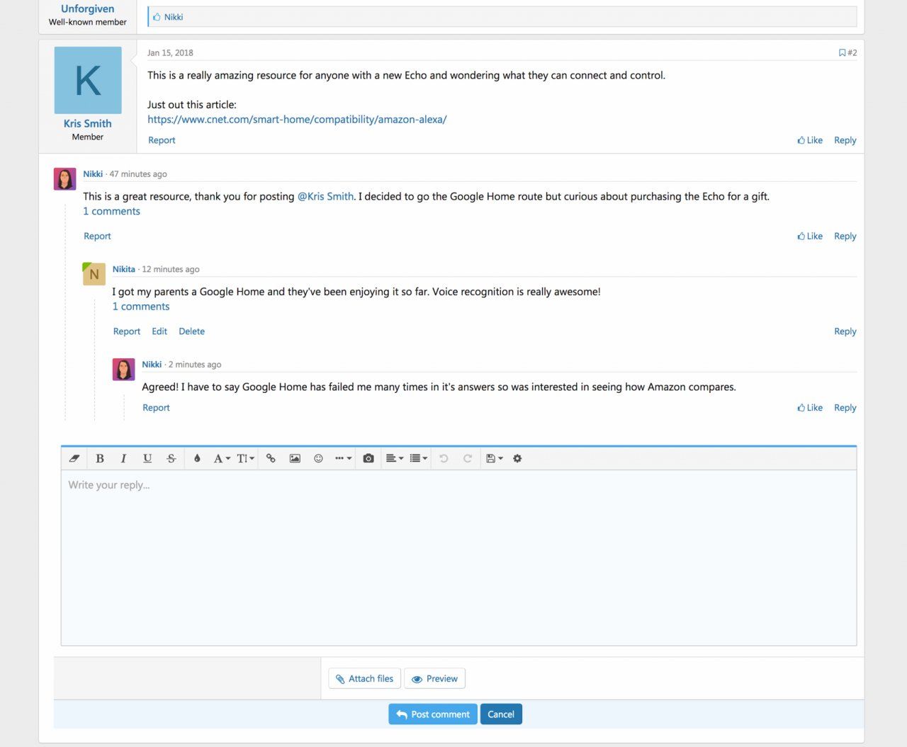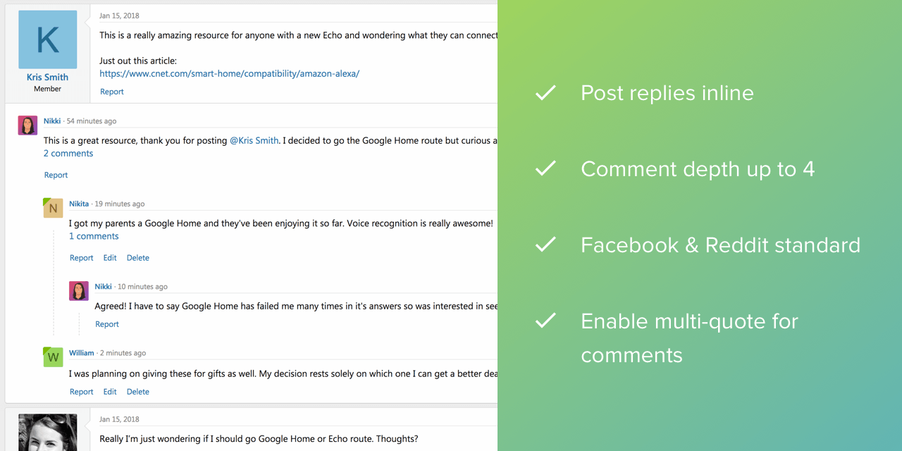 Sản phẩm này cho phép các thành viên trả lời trực tiếp vào bài đăng và để nó hiển thị lồng nhau và nội tuyến giống như Reddit và Facebook .