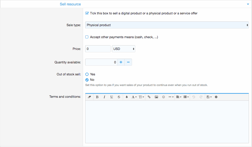 Khi thêm tài nguyên vào các danh mục này, người dùng của bạn sau đó có thể chọn họ có bán nó hay không.